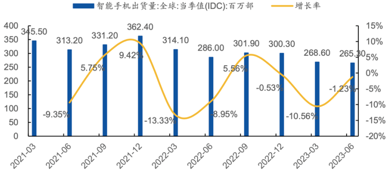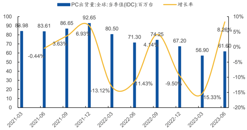 本轮芯片周期从2021年下半年开始下行,至2023年二季度消费电子降幅趋缓。数据显示,23年二季度全球PC出货量同比下降13%,环比上升8%;智能手机市场同比下降7%,环比下降1%,市场衰退有所放缓。