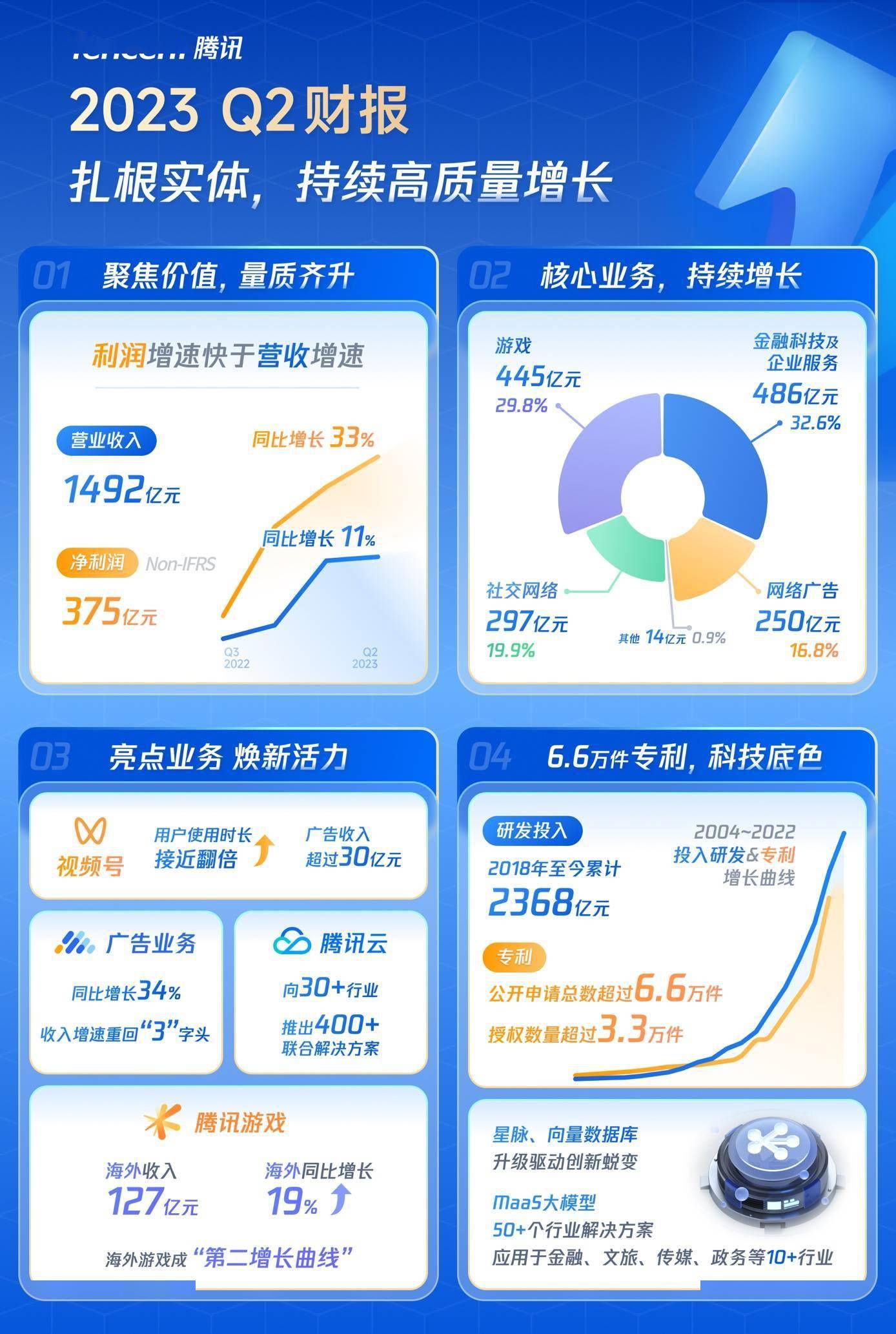 腾讯控股(00700.HK)2023 年第二季度财报显示,公司实现营收 1492.08 亿元,同比增长 11%,净利润(Non-IFRS)375.48 亿元,同比增长 33%。