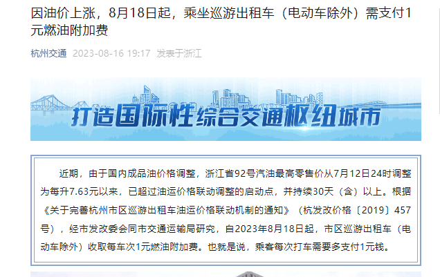 据杭州交通消息,近期,由于国内成品油价格调整,浙江省92号汽油最高零售价从7月12日24时调整为每升7.63元以来,已超过油运价格联动调整的启动点,并持续30天(含)以上。根据《关于完善杭州市区巡游出租车油运价格联动机制的通知》(杭发改价格〔2019〕457号),经市发改委会同市交通运输局研究,自2023年8月18日起,市区巡游出租车(电动车除外)收取每车次1元燃油附加费。也就是说,乘客每次打车需要多支付1元钱。