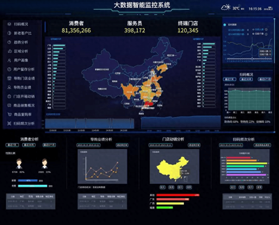 在系统后台,品牌可以随时查看各种用户数据、全国各地的销售数据(门店动销数据、店员卖货数据、门店开箱上架数)、扫码情况、用户画像(消费者画像、导购员画像、门店老板画像等),掌握线下渠道和商品的实时动态。动销数据和用户数据的数字化呈现也意味着渠道窜货将无法掩盖。