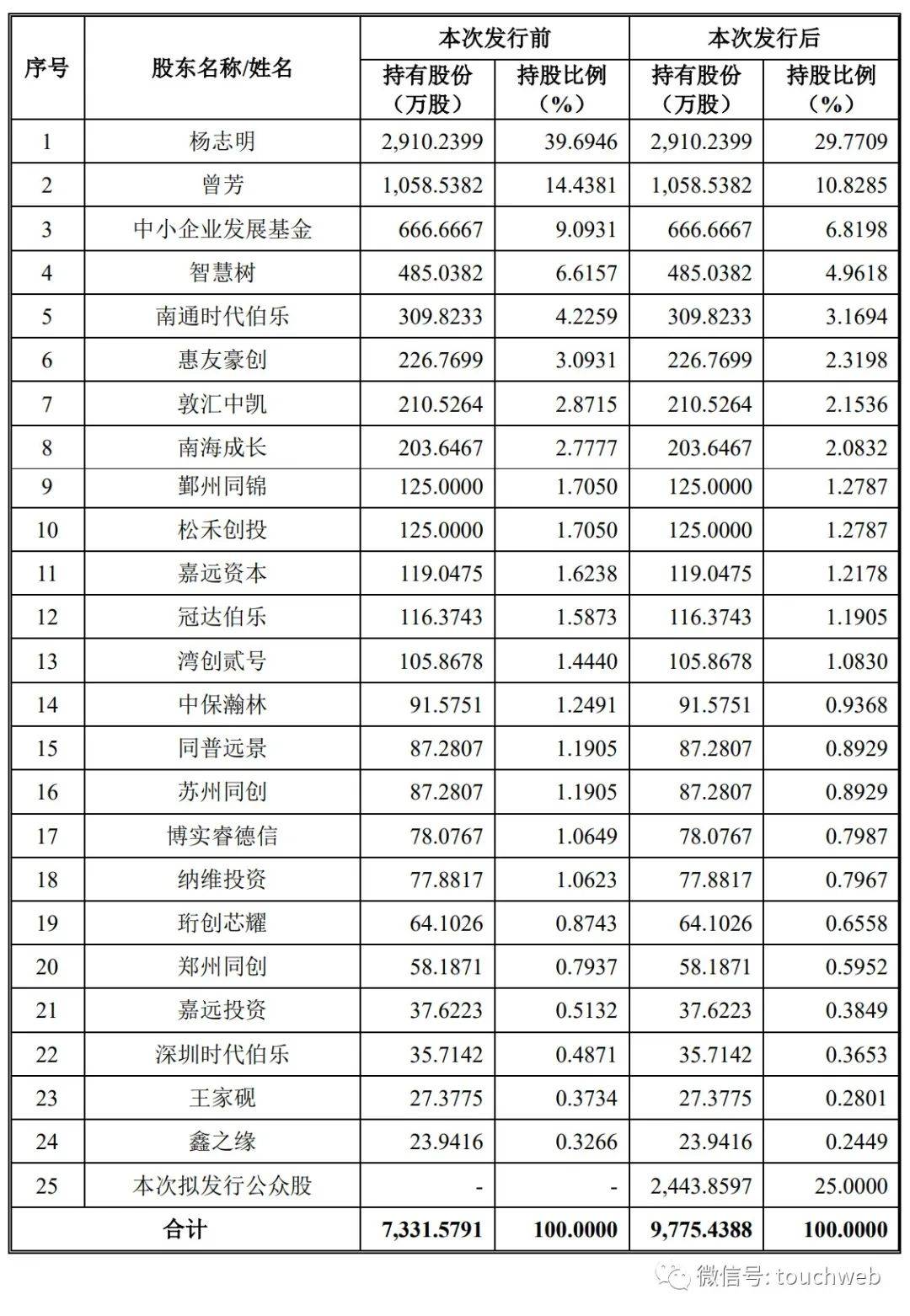 IPO后,杨志明持股为29.7709%,曾芳持股为10.8285%,中小企业发展基金持股为6.8198%,智慧树持股为4.9618%,南通时代伯乐持股为3.1694%,惠友豪创持股为2.3198%,敦汇中凯持股为2.1536%,南海成长持股为2.0832%,鄞州同锦、松禾创投分别持股为1.2787%,嘉远资本持股为1.2178%,冠达伯乐持股为1.1905%;