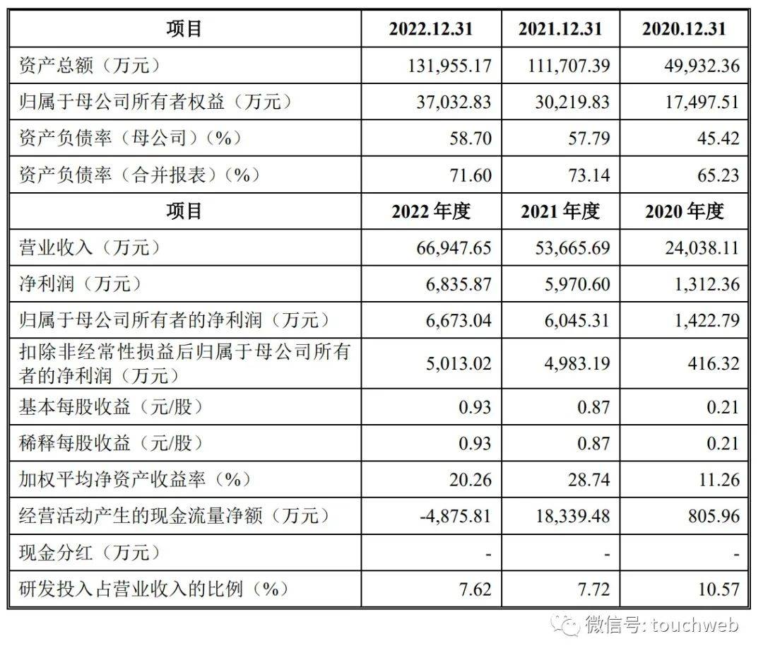 招股书显示,信宇人2020年、2021年、2022年营收分别为2.4亿元、5.37亿元、6.69亿元;净利分别为1312.36万元、5970.6万元、6835.87万元;扣非后净利分别为416万元、4983万元、5013万元。