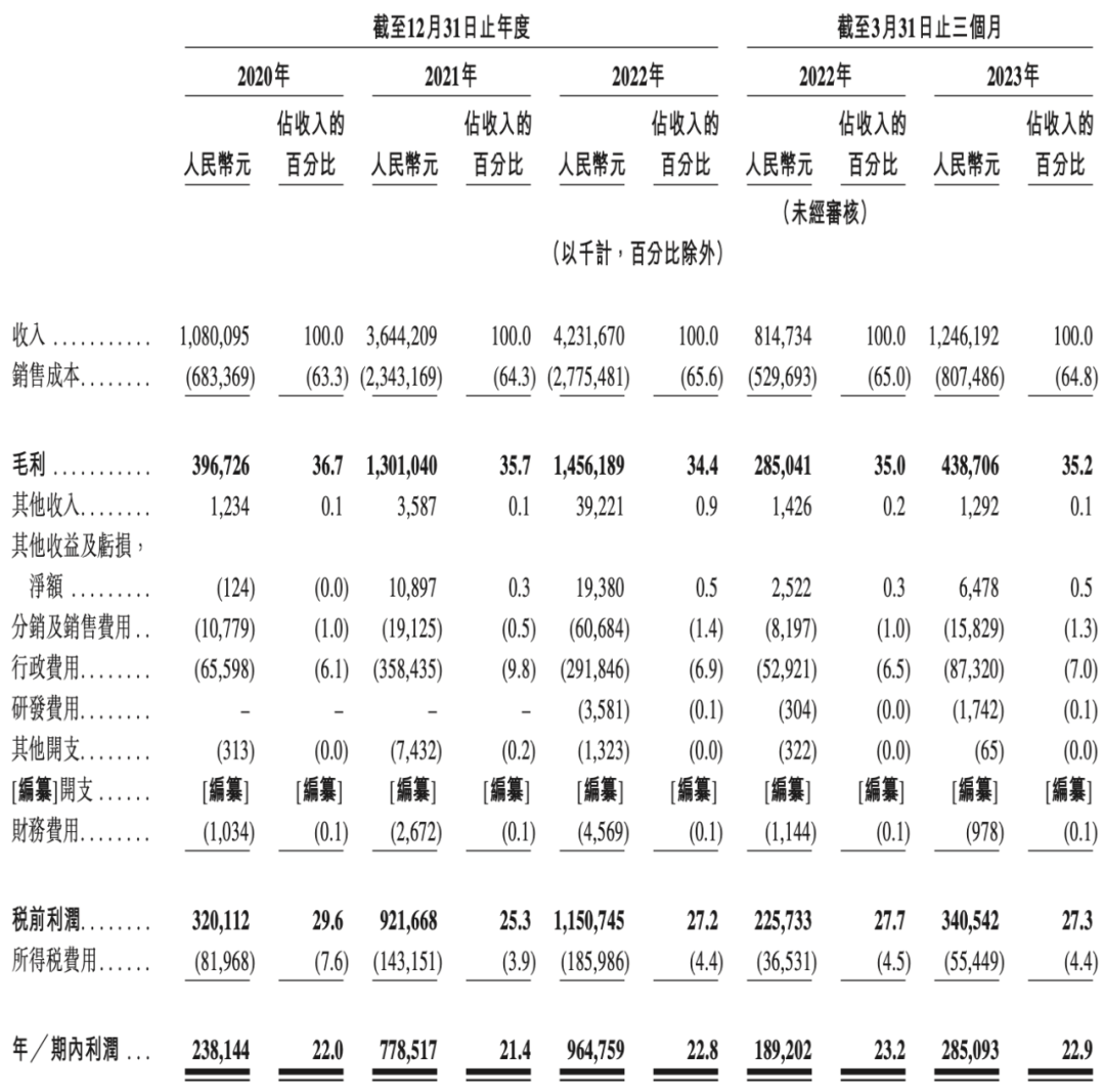 招股书显示,2020年至2023年一季度,茶百道实现营收10.80亿元、36.44亿元、42.32亿元和12.46亿元;同期净利润分别为2.38亿元、7.79亿元、9.65亿元和2.85亿元。