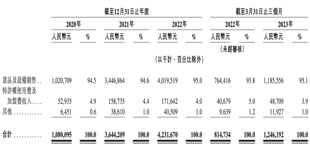 其中,向加盟店销售货品及设备是茶百道最核心的收入来源。2020年至2023年一季度,茶百道来自销售货品及设备的收入占总收入比例均在93%至95%之间。