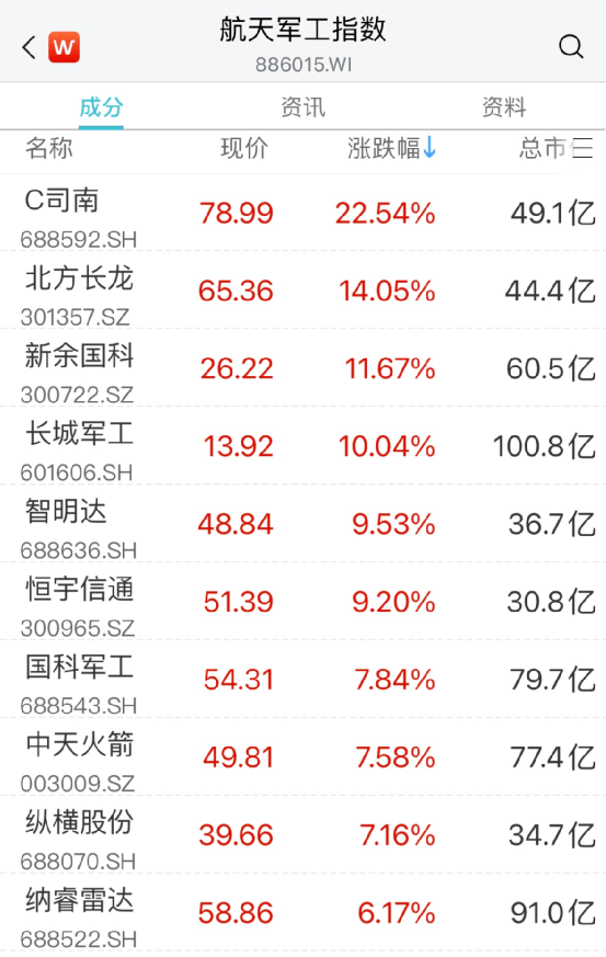航天军工股异动走强,北方长龙涨超14%,长城军工涨停,新余国科、智明达、国科军工等涨幅居前。