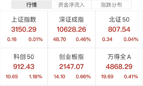 一起来看下上午的市场情况。今天的市场热点轮动,三大指数探底回升,截至午间收盘悉数翻红,沪指涨0.01%,深成指涨0.46%,创业板指涨0.66%,此前深证成指一度跌超1%。