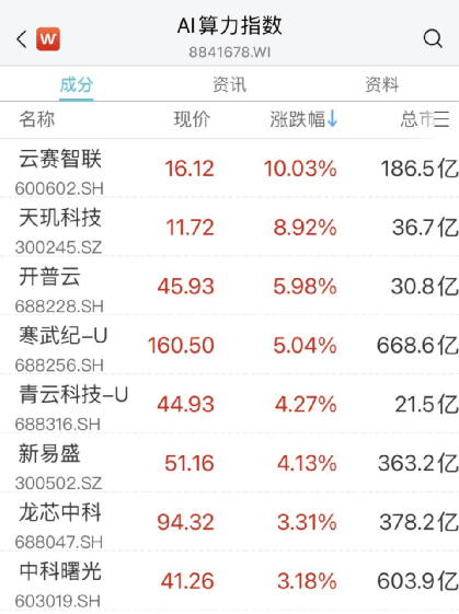 AI算力股集体回暖,云赛智联涨停,天玑科技、开普云、寒武纪-U等纷纷大涨。