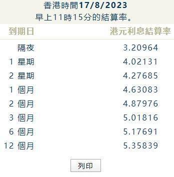 智通财经APP获悉,8月17日,港元拆息全线下跌,其中,隔夜息连跌三天,报3.20964%,创十周新低,与楼按相关的一个月拆息亦降至4.63083%,为6月14日以来最低,与同期美元LIBOR息差扩阔至80基点。中长息方面,反映银行资金成本的三个月拆息跌至5.01816%,险守5%,并逾一个月新低,与同期美元LIBOR息差扩阔至62基点,六个月期降至5.17691%,一年期中止两连升,报5.35839%。