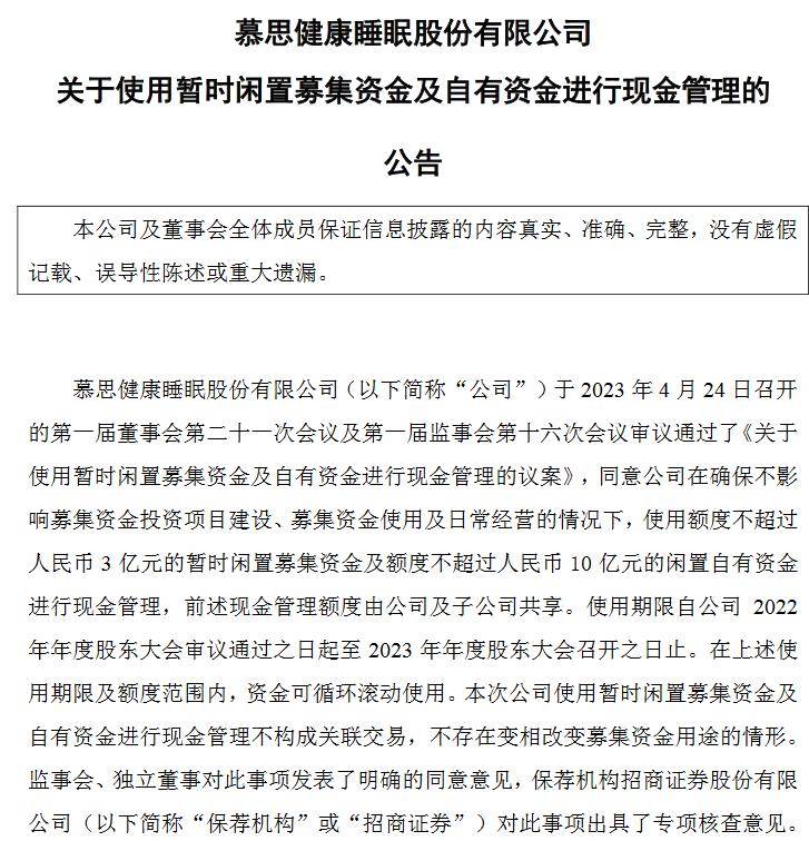 今年4月,慕思股份发布公告,使用额度不超过人民币3亿元的暂时闲置募集资金及额度不超过人民币10亿元的闲置自有资金进行现金管理。