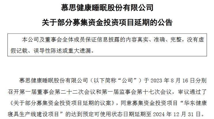 慕思股份于8月16日分别召开第一届董事会第二十二次会议和第一届监事会第十七次会议,审议通过了《关于部分募集资金投资项目延期的议案》,同意募集资金投资项目“华东健康寝具生产线建设项目”的达到预定可使用状态日期延期至2024年12月31日。