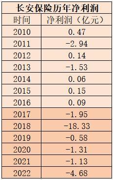 作为首批在互联网进行布局的险企,长安保险曾被时代浪潮推至顶峰,却因踩雷P2P履约险而被打入低谷。近年来,长安保险一直处于亏损状态。《国际金融报》记者梳理年报数据发现,2017年至2022年,长安保险净利润分别为-1.95亿元、-18.33亿元、-0.58亿元、-1.31亿元、-1.13亿元、-4.68亿元,六年时间累计亏损27.98亿元。