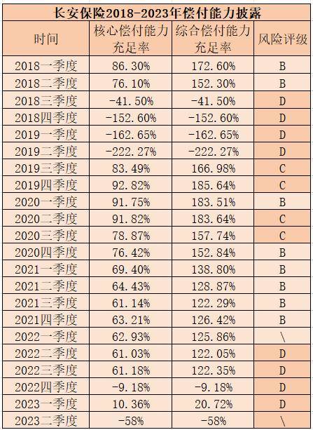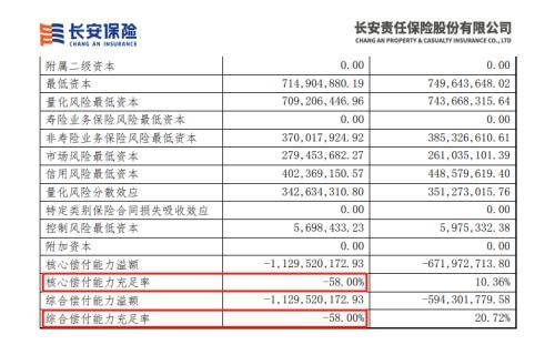 近日,长安责任保险股份有限公司(下称“长安保险”)披露2023年二季度偿付能力报告,其核心偿付能力充足率和综合偿付能力充足率再次跌为负值,均为-58%。