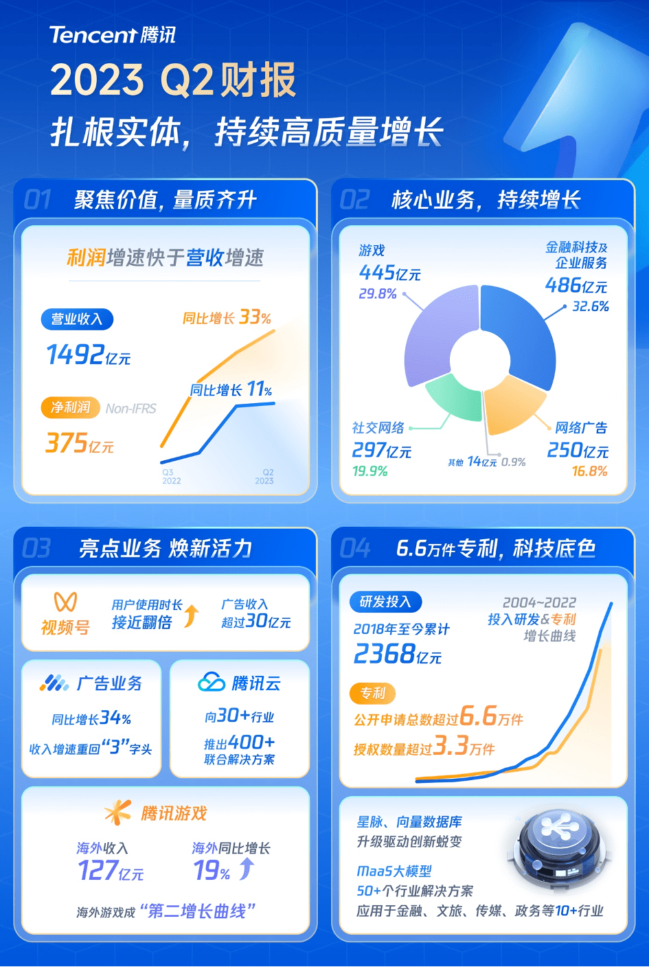 受益于外部环境的回暖和市场需求的复苏,二季度腾讯广告、数实经济等核心主业实现稳健增长。