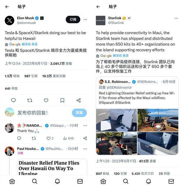 马斯克在推特上指出,他的几家公司正在尽最大努力帮助夏威夷。Starlink官方帐户随后发文表示,超过650个卫星互联网套件已运往40多个组织,帮助岛上的恢复工作。