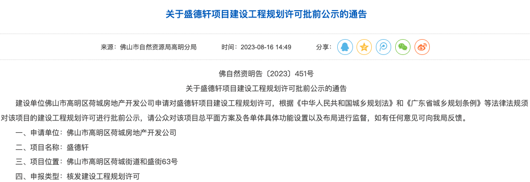 日前,高明区政府网站发布了《关于盛德轩项目建设工程规划许可批前公示的通告》。