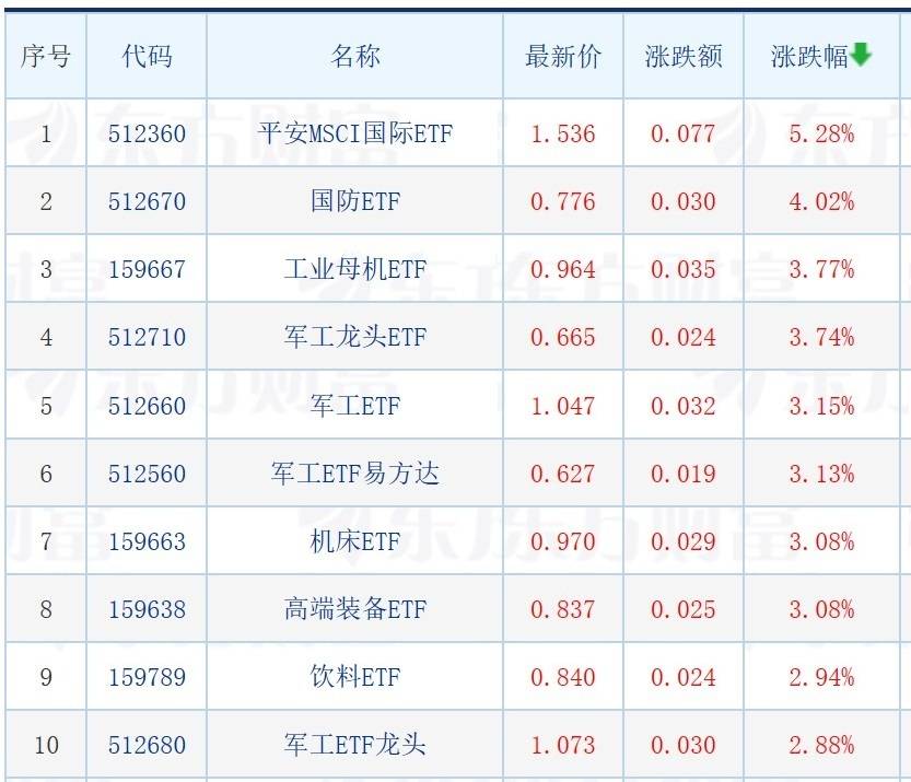 ETF方面,军工、工业母机等相关ETF大涨超3%。