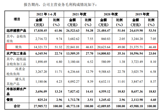 数据显示,营收占比仅在10%左右的鱿鱼却贡献了近半的毛利,而收入占比超过5成的冰冻冰鲜水产品,其毛利率仅为4.03%。大洋世家正面临着跑量的产品不赚钱,赚钱的产品不跑量的困局,造成了整体毛利率偏低。