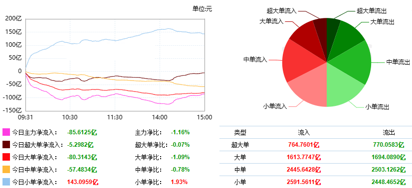 根据东财统计,截止收盘沪深两市呈现资金净流出状态,当日沪深两市资金当日沪深两市资金共流出85.61亿元。其中,超大单净流出5.30亿元,大单净流出80.31亿,中单净流出57.48亿元,小单净流入143.10亿元。