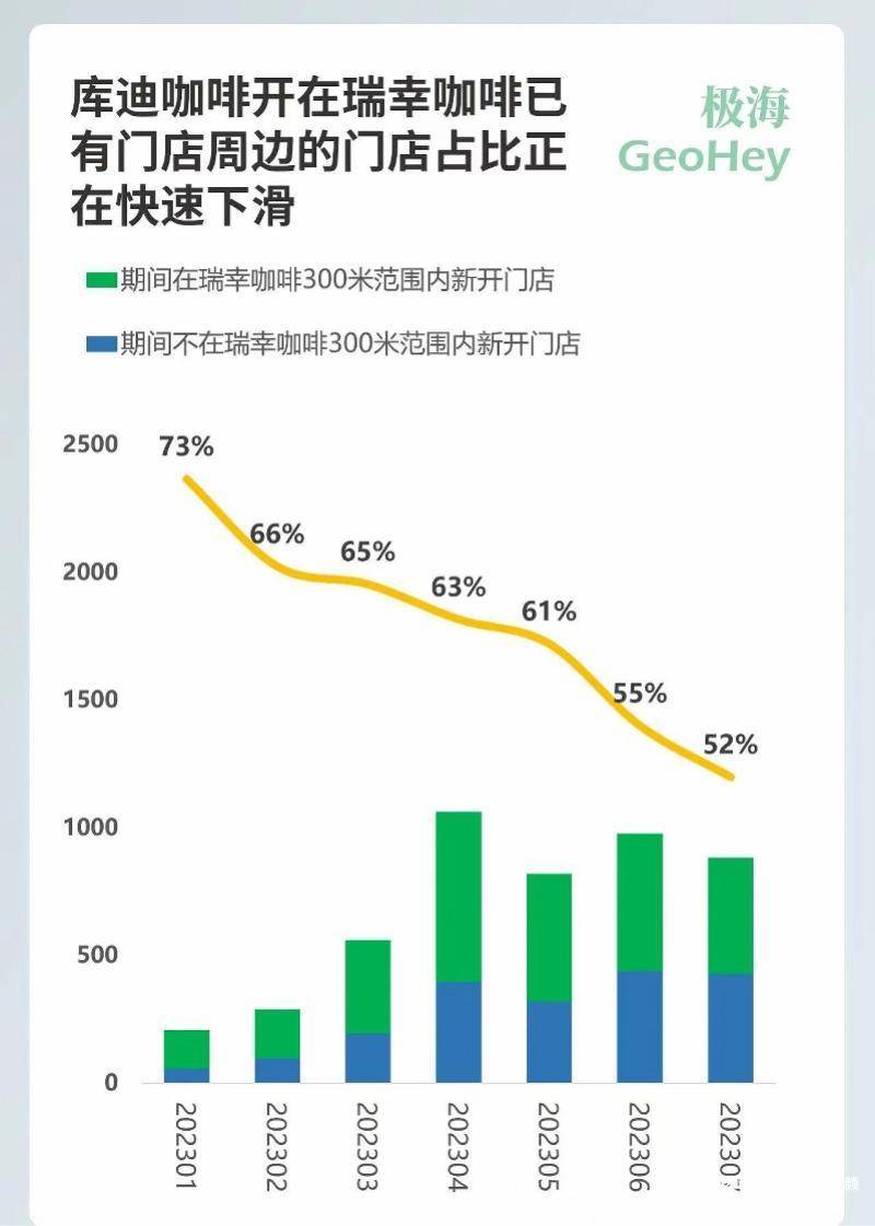跟李鹏一样,今年年初,不少库迪联营商同样选择把店开在瑞幸旁边。根据极海品牌监测的数据,今年1月,库迪新开业的200余家门店中,选择开在瑞幸旁边的占比73%,但是短短半年时间过去,到了今年7月,库迪新开业的近900家门店,选择开在瑞幸旁边的比例下降至52%。