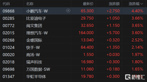 大型科技股多数上涨,小鹏汽汽车、理想汽车、比亚迪电子、阅文集团涨超3%,快手、万国数据等跟涨。