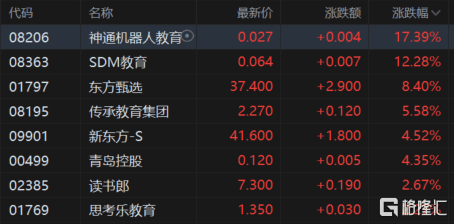 教育股大涨,神通机器人教育涨超17%,SDM教育涨超12%,新东方涨超4%,读书郎、思考乐教育等跟涨。