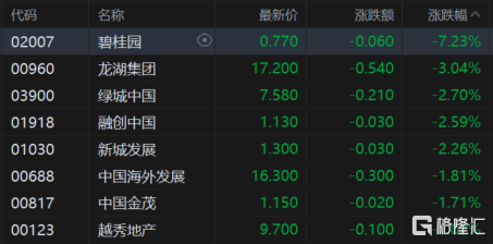 内房股走弱,碧桂园跌超7%,龙湖集团跌超3%,绿城中国、融创中国、新城发展等跟跌。