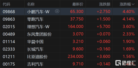 汽车股反弹,小鹏汽车、零跑汽车涨超4%,理想汽车涨超3%,东风集团、长城汽车、吉利汽车等跟涨。