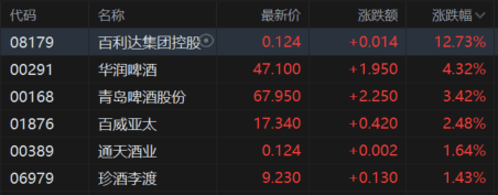 酒精饮料股表现活跃,百利达集团涨超12%,华润啤酒涨超4%,青岛啤酒、百威亚太等跟涨。