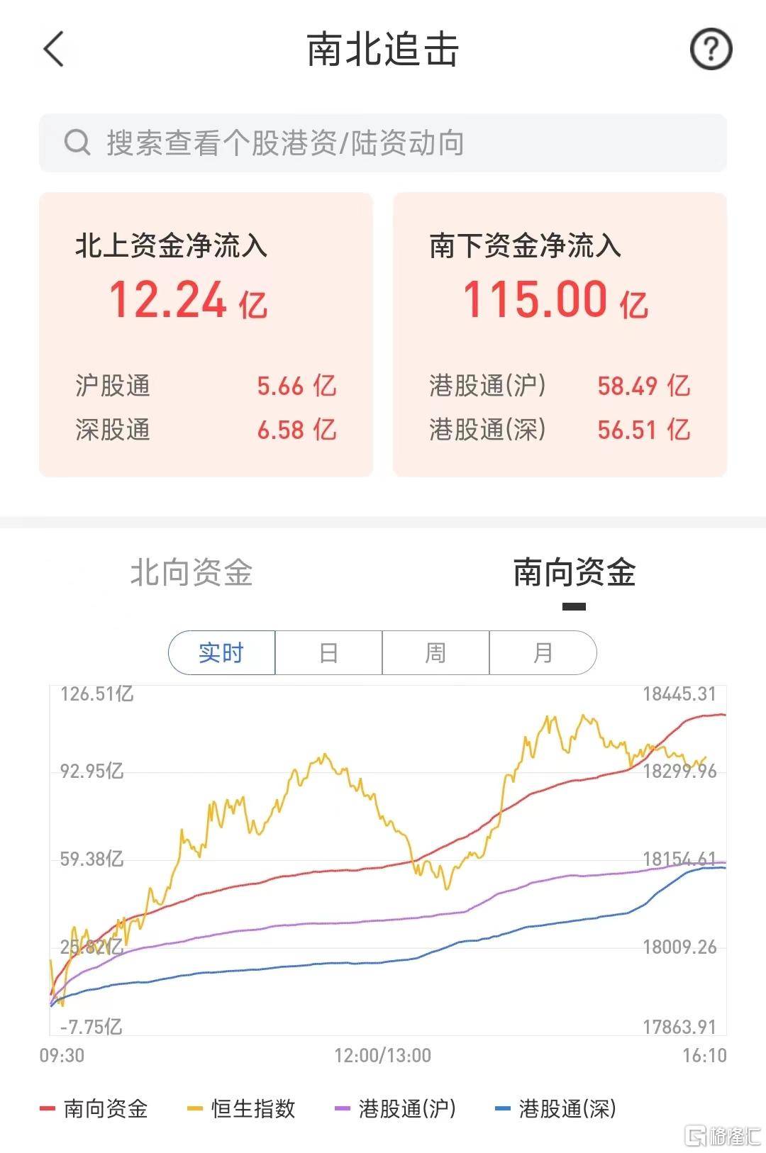 今日南下资金净流入115亿港元,其中港股通(沪)净流入58.49亿港元,港股通(深)净流入56.51亿港元。