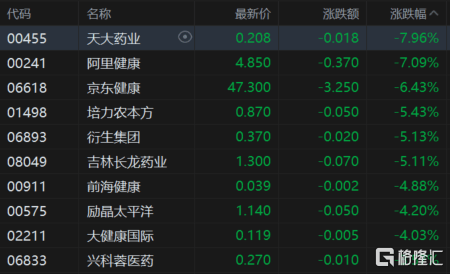 医药股持续调整,阿里健康、天大药业跌超7%,京东健康跌超6%,百济神州、药明生物等跟跌。