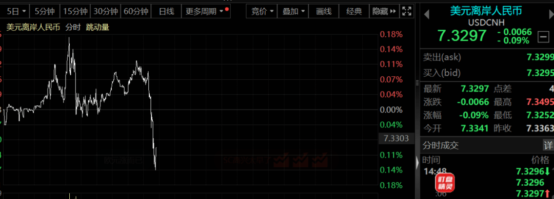 值得一提的是,今天午后,人民币亦是大反攻。在岸人民币兑美元几乎抹去此前跌幅,现回升至7.30附近。离岸人民币亦由跌转涨。