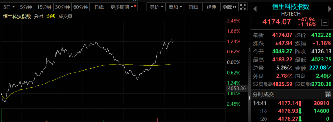 值得注意的是,港股持续拉升,恒指转涨,恒生科技指数涨超1%,早盘均跌超2%。