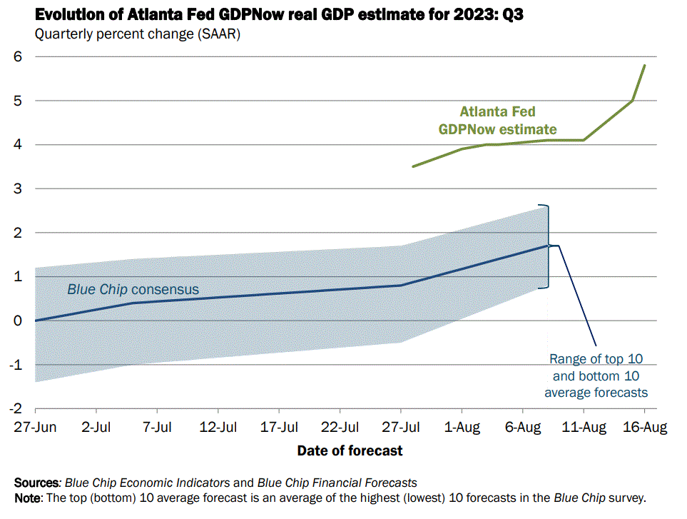 日内,得益于新屋开工数和工业产出数据双双强于预期,亚特兰大联储GDPNow模型再次上调了对美国第三季度实际GDP的增速预期——年化环比增速有望达到5.8%,昨日的增速预期为5.0%。