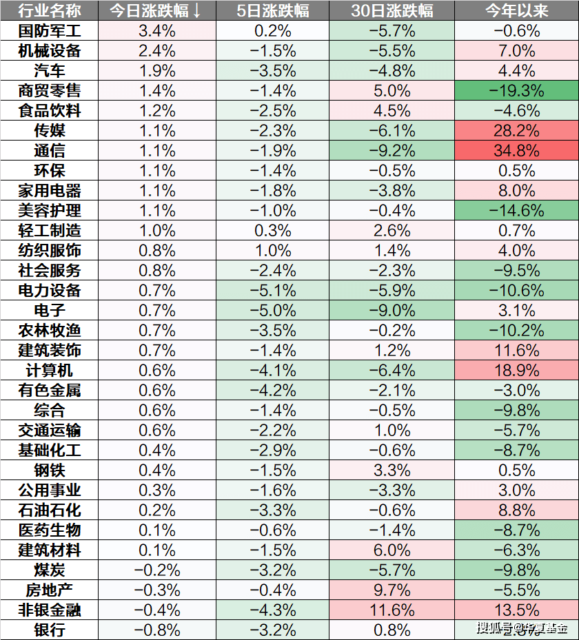 行业上来看,国防军工、机械设备、汽车等板块上涨,房地产、非银金融、银行等板块下跌。