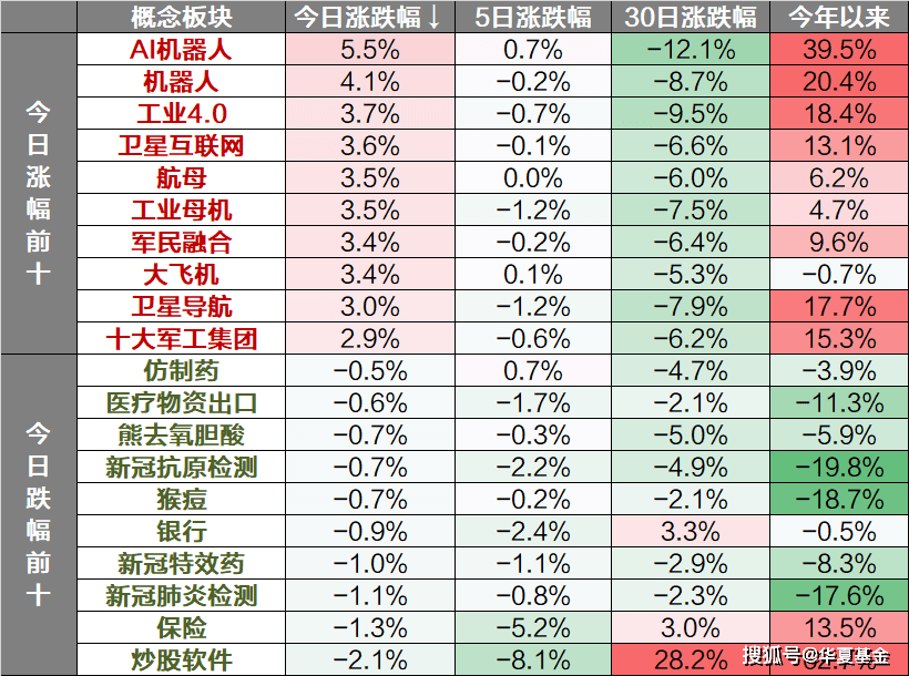 概念主题方面,AI机器人、机器人、工业4.0板块领涨,新冠肺炎检测、保险、炒股软件跌幅居前。