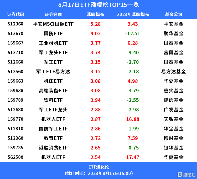 ETF方面,军工板块久违上涨,鹏华基金国防ETF、富国基金军工龙头ETF分别涨4.02%、3.74%。工业母机板块涨幅居前,国泰基金工业母机ETF、华夏基金机床ETF分别涨3.77%、3.08%。啤酒板块上扬,建信基金饮料ETF涨2.94%。机器人板块表现活跃,天弘基金机器人ETF涨2.87%。