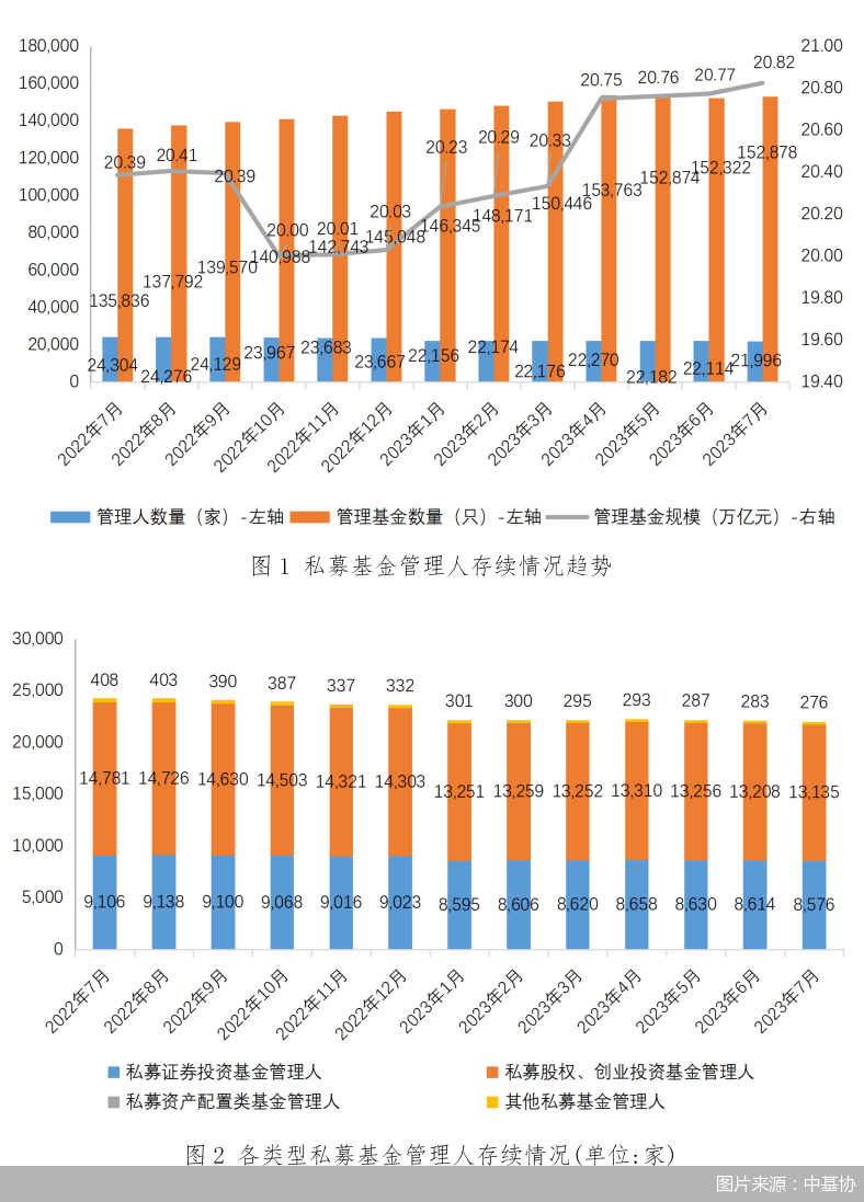 截至2023年7月末,存续私募基金管理人21996家,管理基金数量15.29万只,管理基金规模20.82万亿元。其中,私募证券投资基金管理人8576家,私募股权、创业投资基金管理人13135家,私募资产配置类基金管理人9家;其他私募投资基金管理人276家。