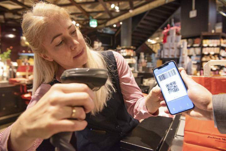 奥地利维也纳,一名咖啡店工作人员扫描一位顾客的支付宝支付二维码。新华社记者 郭晨 摄