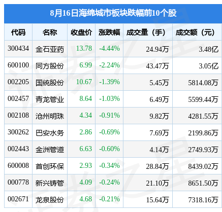 8月16日海绵城市板块较上一交易日上涨0.33%,新城市领涨。当日上证指数报收于3150.13,下跌0.82%。深证成指报收于10579.56,下跌0.94%。海绵城市板块个股涨跌见下表: