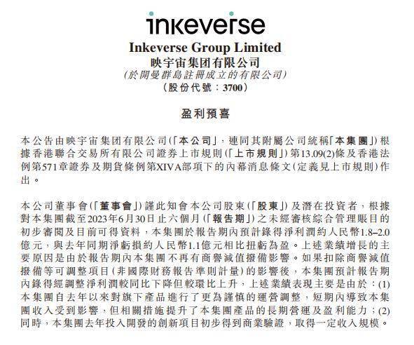 8月17日,映宇宙(3700.HK)发布2023上半年盈利预喜公告。截至2023年6月30日,映宇宙预计录得净利润约人民币1.8-2.0亿元,较去年同期因商誉减值亏损约人民币1.1亿元相比,实现扭亏为盈。报告期内,集团不再受商誉减值拨备影响。