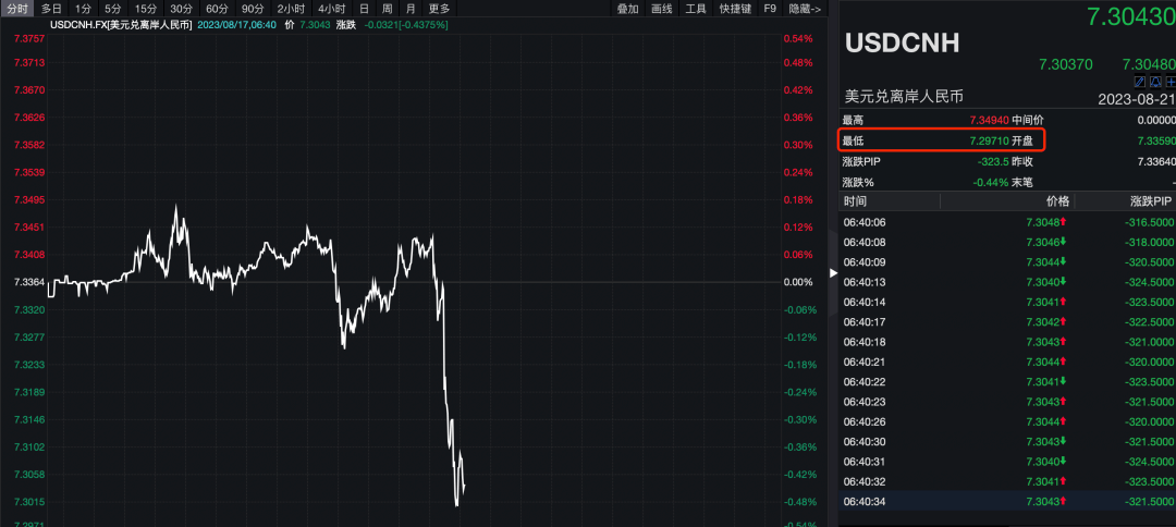 在《报告》发布之后,A50指数期货、人民币汇率均出现直线拉升。其中,离岸人民币兑美元快速拉升,日内涨幅一度达0.5%,1个小时内拉升超400点,一度收复7.30关口。