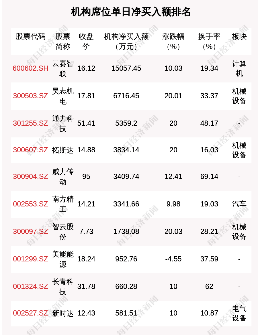2:在龙虎榜中,涉及机构专用席位的个股有20只,净买入额前三的是云赛智联、昊志机电、通力科技,分别为1.51亿元、6716.45万元、5359.2万元。