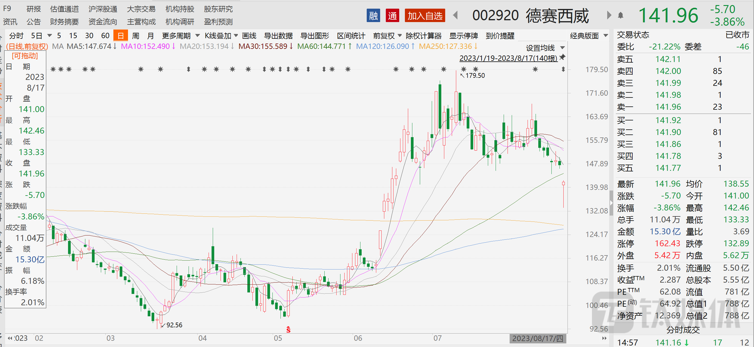 让人疑惑的是,这份喜人的中报发布后,公司股价竟然大幅下挫,今日盘中最低下探至133.33元,一度创下近两个月新低。截至8月17日收盘,股价报收141.96元,下跌3.86%,总市值788亿元。
