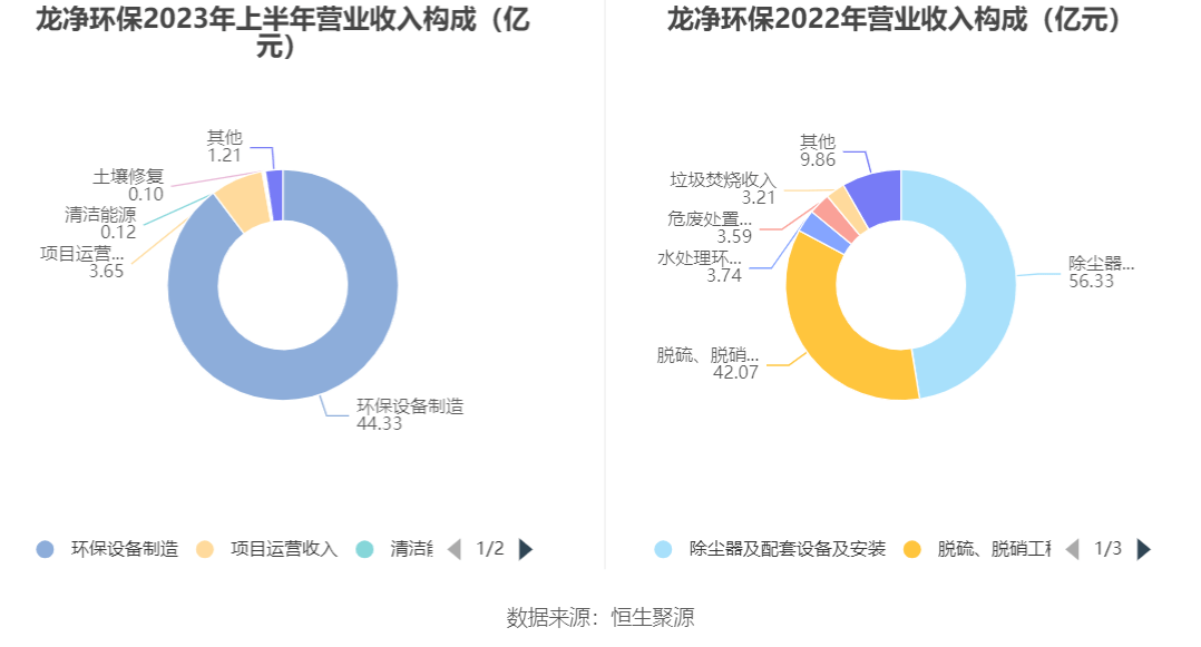 分产品来看,2023年上半年公司主营业务中,环保设备制造收入44.33亿元,同比增长1.91%,占营业收入的89.72%;项目运营收入收入3.65亿元,同比下降11.75%,占营业收入的7.38%;清洁能源收入0.12亿元,占营业收入的0.24%。