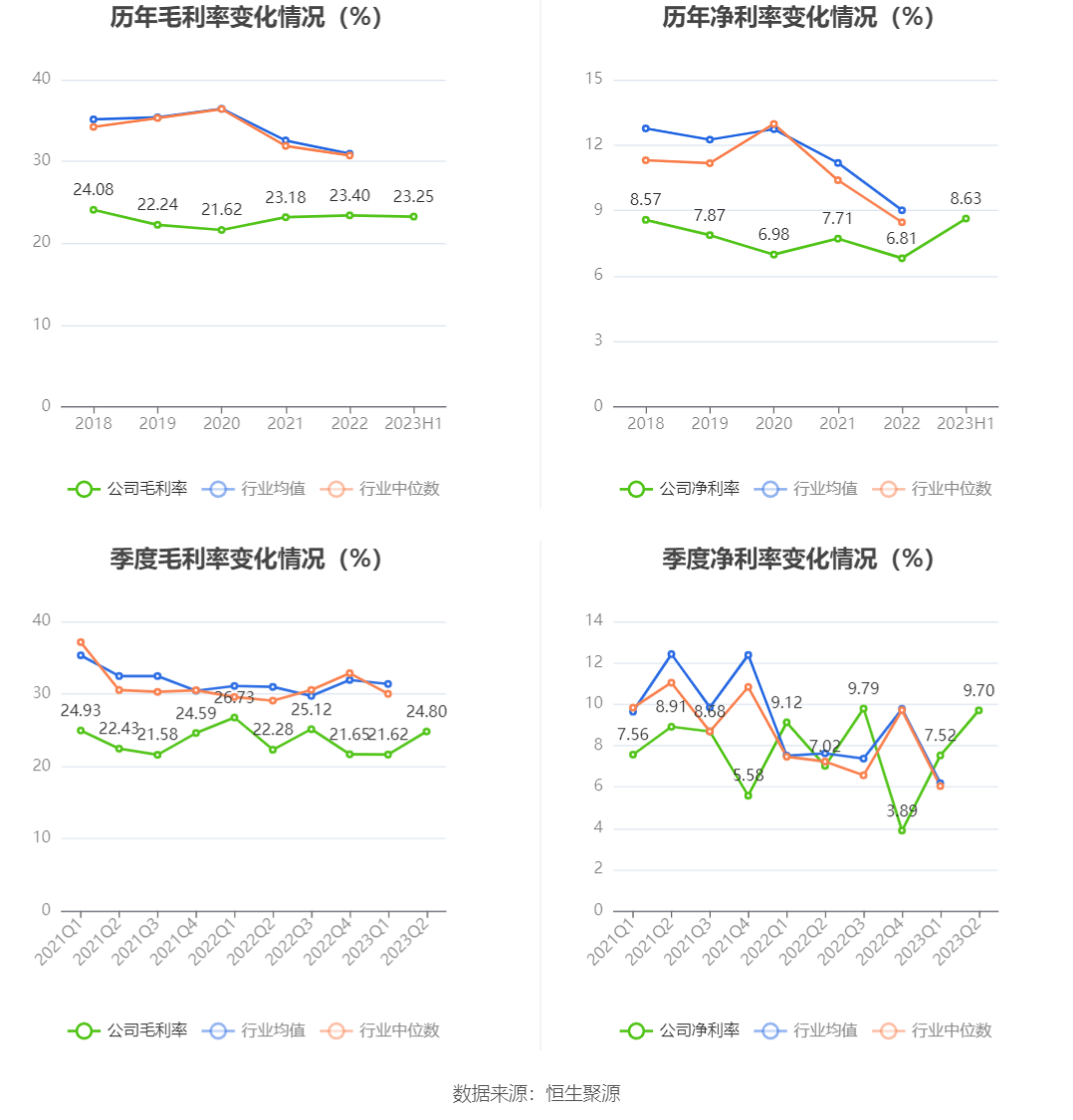 2023年上半年,公司毛利率为23.25%,同比下降0.80个百分点;净利率为8.63%,较上年同期上升0.78个百分点。从单季度指标来看,2023年第二季度公司毛利率为24.80%,同比上升2.52个百分点,环比上升3.18个百分点;净利率为9.70%,较上年同期上升2.68个百分点,较上一季度上升2.18个百分点。