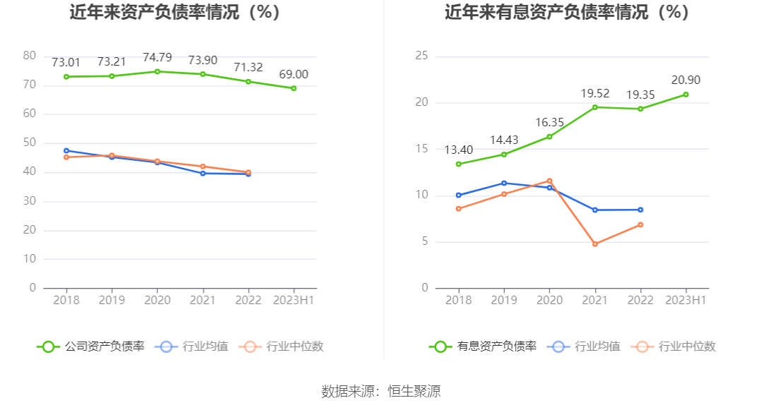偿债能力方面,公司2023年二季度末资产负债率为69%,相比上年末减少2.32个百分点;有息资产负债率为20.90%,相比上年末增加1.55个百分点。
