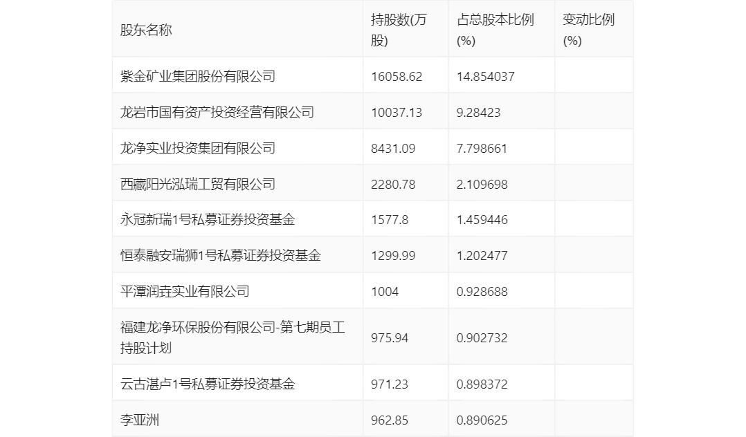 半年报显示,2023年上半年末的公司十大流通股东中,持股最多的为紫金矿业集团股份有限公司,占比14.854%。在具体持股比例上,永冠新瑞1号私募证券投资基金、恒泰融安瑞狮1号私募证券投资基金持股有所上升,紫金矿业集团股份有限公司、龙岩市国有资产投资经营有限公司、龙净实业投资集团有限公司、西藏阳光泓瑞工贸有限公司、平潭润垚实业有限公司、第七期员工持股计划、云古湛卢1号私募证券投资基金、李亚洲持股有所下降。