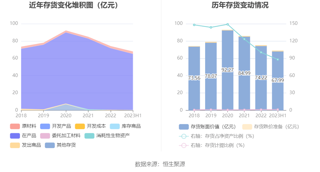 从存货变动来看,截至2023年上半年末,公司存货账面价值为67.99亿元,占净资产的88.04%,较上年末减少6.23亿元。其中,存货跌价准备为9517.55万元,计提比例为1.38%。