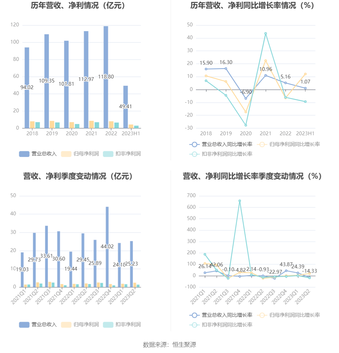 根据半年报,公司第二季度实现营业总收入25.23亿元,同比下降14.33%,环比增长4.34%;归母净利润2.43亿元,同比增长19.15%,环比增长31.43%;扣非净利润1.36亿元,同比下降18.98%,环比下降13.96%。