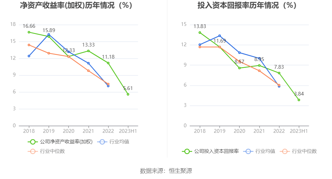 数据显示,2023年上半年公司加权平均净资产收益率为5.61%,较上年同期增长0.22个百分点;公司2023年上半年投入资本回报率为3.84%,较上年同期增长0.11个百分点。